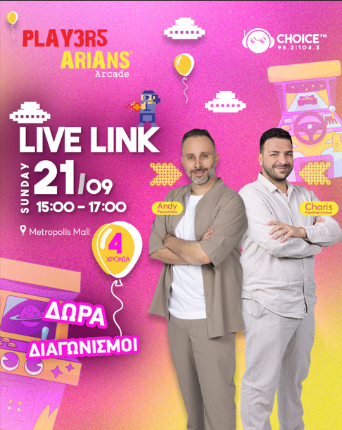 4 χρόνια γεμάτα παιχνίδι! 4 χρόνια γεμάτα διασκέδαση! Κυριακή 21 Σεπτεμβρίου, το Players Arians Arcade στο Metropolis Mall στη Λάρνακα, γιορτάζει τα 4 χρόνια λειτουργίας του και προσκαλεί όλους τους gamers, μικρούς και μεγάλους, να έρθουν να παίξουν, να διαγωνιστούν και να ζήσουν τη διασκέδαση στο έπακρο με δώρα και πολλές εκπλήξεις! Ο Choice FM θα είναι εκεί, σε ένα παιχνιδιάρικο live link 3 με 5 το απόγευμα, παρέα με τους Άντυ Παναγιώτου και Χάρη Παπαθεοχάρους! Κυριακη 21 Σεπτεμβριου, ραντεβου στο Players Arians Arcade… Let the fun begin!